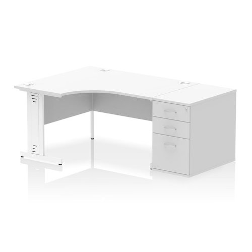 Impulse 1400mm Left Crescent Office Desk White Top White Cable Managed Leg Workstation 800 Deep Desk High Pedestal
