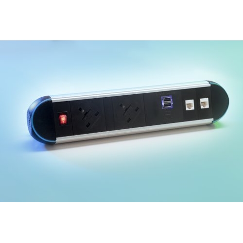 Impulse Desktop Module 2 x UK Sockets (3.15A), 1 x Neon Switch, 1 x 500mm Lead to 3 Pole Connector, 1 x Smart Charge, 2 x CAT5Ee Data in White