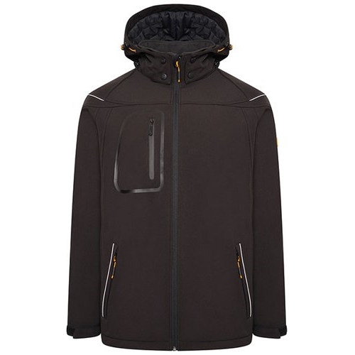 JCB Trade Hooded Softshell L. Shell fabric 92% Polyester. 8% Spandex softshell with poly fleece underneath 320gm. Detachable button hood. Underarm zipped air vents. Right chest pocket with zip. 2 side entry zipped pockets with reflective piping. Inner patch pocket with zip. Inner phone pocket.