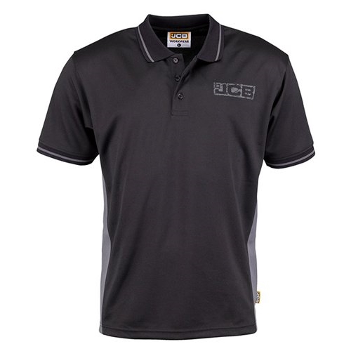 JCB Trade Black/Grey Polo L. 100% Wicking Polyester 175gsm. Anti bacterial moisture management. 3 button front placket. Distressed JCB logo on left chest. Contrast panels under each arm. Contrast tipping on collar and cuffs.