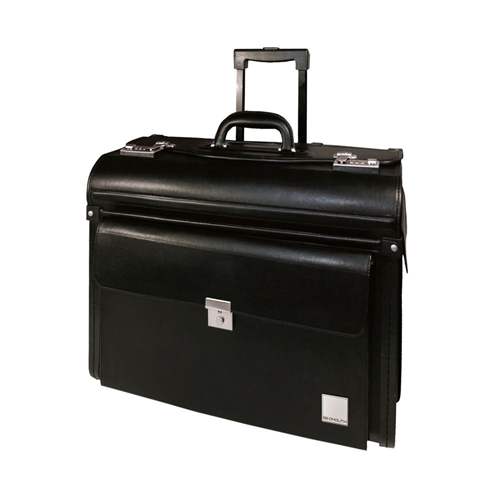 This stylish leather look Monolith pilot case features a telescopic handle and durable in-line skate wheels for easy portability. The large central compartment features a padded section for laptops up to 15.6 inches. The case also features lockable side pockets with nickel locks and a lid organiser. This black case measures W480 x D240 x H370mm.
