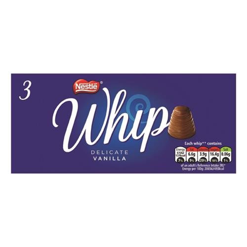 Delicious and delicate milk chocolate cones encasing a lusciously soft and creamy vanilla centre. Each of these Nestle Whips is individually wrapped for freshness and are ideal for sharing. These iconic treats are beloved all over the country and contain no artificial colours, flavours or preservatives. This pack contains three incredibly indulgent whips.