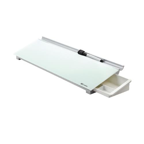 The unique Nobo Diamond Glass Desktop Pad blends stylish minimalist form with maximum function. The frameless dry-erase glass offers the highest resistance to stains and scratches. Simply write, wipe clean away and start afresh. Alternatively, post notes onto the tempered glass surface. Conveniently locate the desk pad behind a keyboard and use its concealed drawers to keep your desk tidy. Supplied with a mini marker with an eraser on the cap.