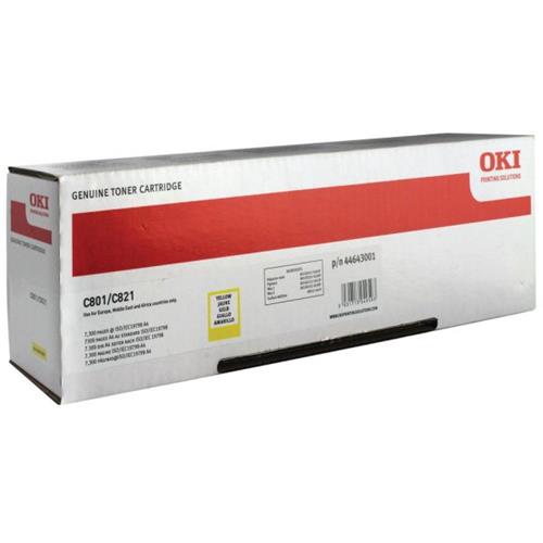 Install a genuine OKI Yellow Toner Cartridge (44643001) in your OKI C801 or C821 laser printer and enjoy unparalleled quality and reliability. You'll notice faded print or a Toner Low message on your printer when the current cartridge is running low. To resume printing quickly, make sure you order a new toner cartridge and install it when you see the Toner Empty message. This standard yield toner cartridge is packed with enough colour toner to print 7,300 pages.