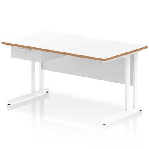 Oslo 1400 x 800mm Scalloped Edge Straight Office Desk White Top Natural Wood Edge White Cantilever Leg Workstation 1 x 1 Drawer Fixed Pedestal