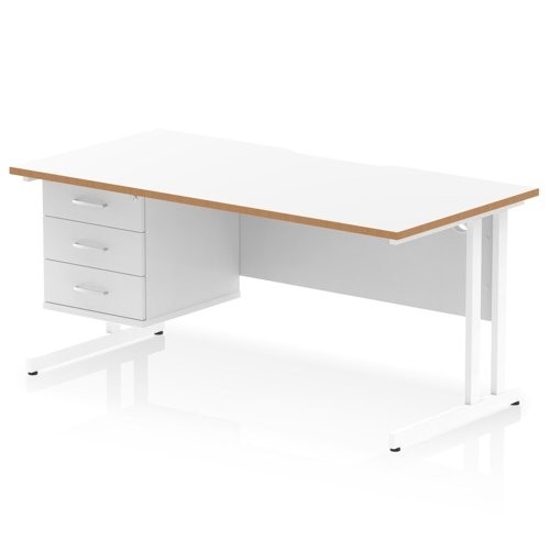 Oslo 1600 x 800mm Scalloped Edge Straight Office Desk White Top Natural Wood Edge White Cantilever Leg Workstation 1 x 3 Drawer Fixed Pedestal