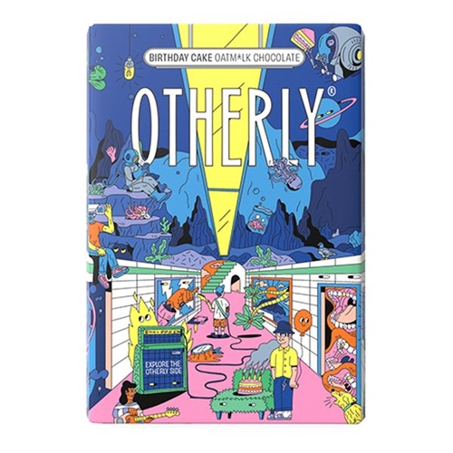 OTHERLY Birthday Cake Oatm*lk is a plant-based chocolate 43% cacao content made with fine flavour cocoa beans from Colombia and oat powder; Taking a bite, the chocolate yields with a satisfying snap, releasing a burst of flavors on your palate. The creamy, velvety texture of the oatm*lk chocolate envelops your taste buds, providing a luxurious mouthfeel that complements the sweetness perfectly.Within this harmonious blend, you encounter crunchy bits that add a delightful contrast to the smoothness. These are the cake-like components, woven into the chocolate, imitating the tender crumb of a birthday cake. Each nibble brings forth playful sensations, as a sensory celebration, delighting both the taste buds and the heart.