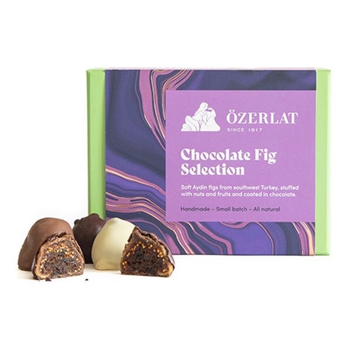 Our Chocolate Fig Selection is an indulgent luxurious treat! Turkey's Aydin figs are famed for their soft skin and honey-sweet taste, which is protected by a PDO from European Commussion for their unique harvesting by only specialized and experienced farmers. We love them as they are, but couldn't resist these blissful confections that really highlight their specialness. Each fig is filled with a unique mix of fruits and nuts and hand enrobed in chocolate. You'll find 12 figs in the box, four each of: Dark Chocolate & Apricot – stuffed with chopped dried Malalya apricots, prunes, sultanas and bitter orange peel, then hand-coated in rich dark chocolate. Milk Chocolate & Hazelnut – stuffed with chopped sultanas and a whole roasted hazelnut, then hand-coated in velvety smooth milk chocolate. White Chocolate & Pistachio – stuffed with chopped pistachios, almonds, walnuts, sultanas, apricot and lemon peel, then hand-coated in creamy white chocolate.The box contains 12 chocolate figs, 4 of each chocolate.