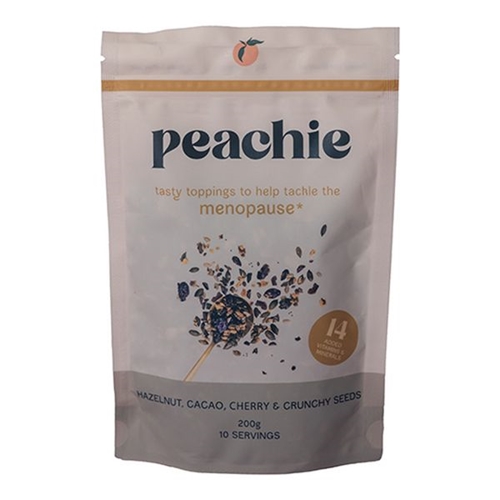 Peachie tasty toppings to help tackle the menopause. Gently toasted hazelnuts, satisfying cacao, crunchy seeds, and juicy cherries, all boosted with our bespoke Peachie menopause supplement which has carefully selected vitamins & minerals.