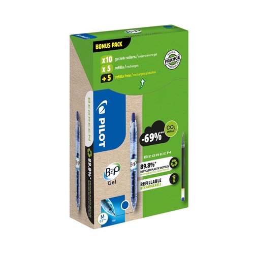 This pack includes 10 Pilot B2P Gel Ink Rollerball Pens and 10 refills. The smooth-writing gel ink gives a writing experience that glides across the page. To help you do your bit for the planet, these pens are refillable and made with 89% recycled plastic components. The B2P GEL is made using PET plastic - the same plastic that goes into drinks bottles.