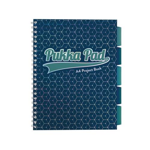 The Pukka Pad Glee Range adds some iridescence to a classic design. This dark blue project book features a geometric iridescent foil design on the cover with the Pukka Pad logo. The A4 project book includes 200 pages of quality 80gsm paper with dividers and index tabs for separating subjects or ideas.
