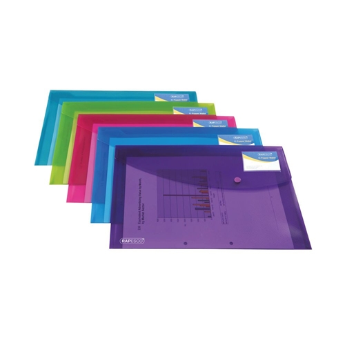 These Rapesco ID Popper Wallets are made from durable, transparent coloured polypropylene for stylish storage of up to 50 sheets of A4 80gsm paper. Great for filing unpunched papers the folder has a secure press stud closure and convenient pen holder. The handy pocket on the front cover allows you to label and personalise each folder for easy reference. This pack contains five A4+ folders in translucent aqua, blue, lime, purple and ruby.