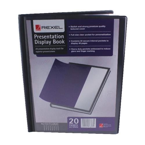 This Rexel premium quality, hard backed, professional display book is the perfect tool to professionally manage, organise and present your documents. This black display book features 20 pockets and a metallic outer casing for that extra modern and professional edge. A clear pocket on the front of the cover allows for full customisation. This display book also features handy clear pockets tucked away on the inside cover for CD's, DVD's and business cards to ensure you are fully prepared for any meeting or presentation on the go.