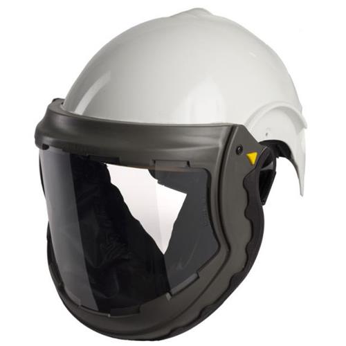 - Safety helmet and rail-mounted retractable visor with flexible chin seal