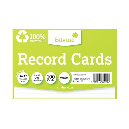 Ideal for students, home office, office and personal use, the Silvine record cards are made from 100% recycled materials. Measuring 152mm x 102mm (6" x 4") and pre-printed with lines and a headline, the white record cards are supplied in a pack of 100.