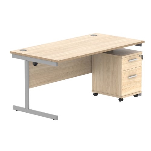 Single Upright Rectangular Desk + 2 Drawer Mobile Under Desk Pedestal 1600X800 Canadian Oak/Silver