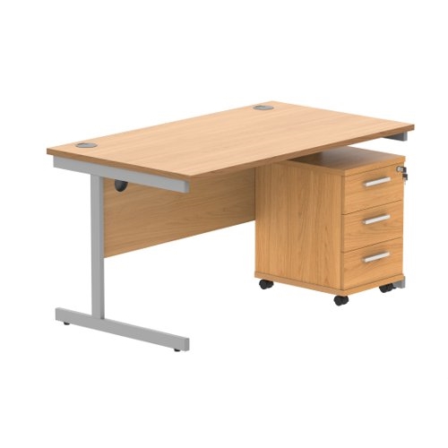 Single Upright Rectangular Desk + 3 Drawer Mobile Under Desk Pedestal 1400X800 Norwegian Beech/Silver