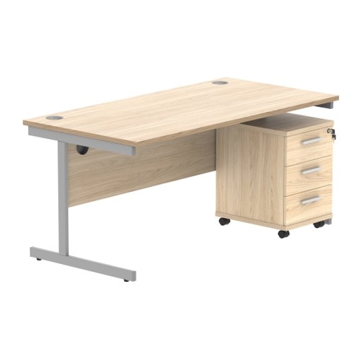 Single Upright Rectangular Desk + 3 Drawer Mobile Under Desk Pedestal 1600X800 Canadian Oak/Silver