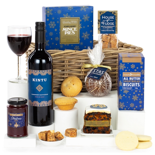 Complete your festive spread with the decadent Maxwell & Franks Iced Cake adorned with a Blue Snowflake Plaque. Presented in a charming Kubu Basket, this hamper is a delightful gift that promises to enchant and delight all who receive it.