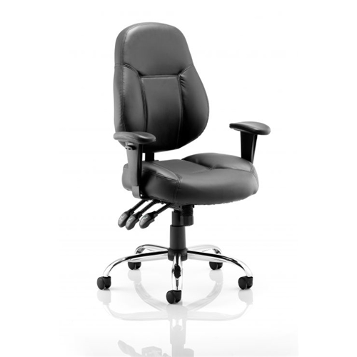 The Storm has an array of functions whilst maintaining a solid build quality. The deeply cushioned seat and backrest are upholstered with a durable bonded leather and finished with a simple stitch detail. Height adjustable arms and 5 star chrome base are included.