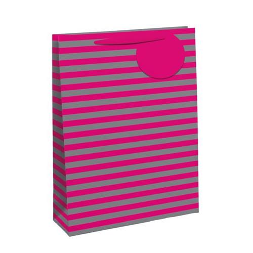 A brightly coloured way to present your gifts, this bag is ideal for a range of occasions. It comes in a fun pink and Silver striped design with a ribbon handle and a circular gift tag.
