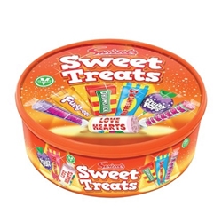 Each tub contains Drumstick Lollies, Lemon Refreshers, Strawberry Refreshers, Fudg-eee Chews, Strawberry Fruity Pop, Blackcurrant Fruity Pop, Fizzy Cola Pop, Fizzers, Love Hearts, Parma Violets. All are individually wrapped, contain no artificial colours and are suitable for Vegans. Each tub weighs 600g.