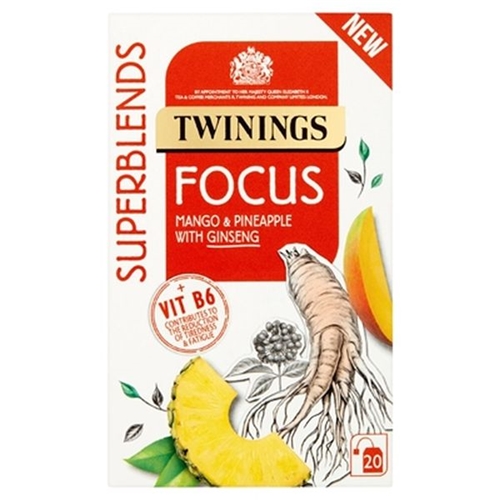 Perfect when you need a pick me up, the Twinings Superblends Focus tea bag collection contains a moreish flavour combination of sweet mango, tart pineapple, earthy ginseng root and Vitamin B6. They are made using all-natural ingredients and are caffeine and sugar free.