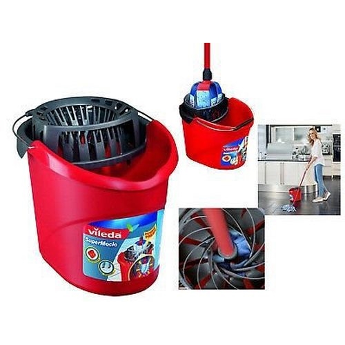 The SuperMocio Bucket and Torsion Wringer for use with SuperMocio mops. The new, unique wringer grabs the mop like a hand, closing all around it, twisting and squeezing it from all sides, ensuring excess water is removed, with less effort.