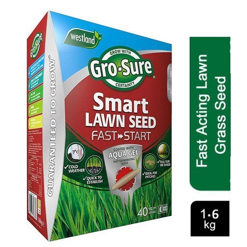 Gro-Sure Fast Start Smart Lawn Seeds have an aqua gel coating technology which soaks up to 400 times its weight in water which gradually releases water to the seed when needed, this technology linked to specially developed seed varieties that germinate at 7 degree Celsius means the seeds germinate quickly even in cold conditions. Covers 25m2. These grass seeds will grow in full sun or shady areas and are ideal for patch repair.