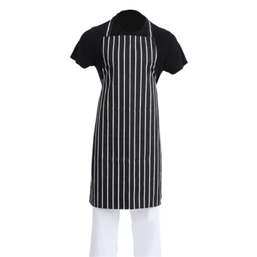 Aprons help to keep staff clean during service and aids in reducing the risk of spills or stains from impacting clothes. This butchers apron from Whites is crafted with a black colourway and white stripes, that helps to hide stains and remain a tidy appearance. The elongated waist straps allow for use within any individual size.