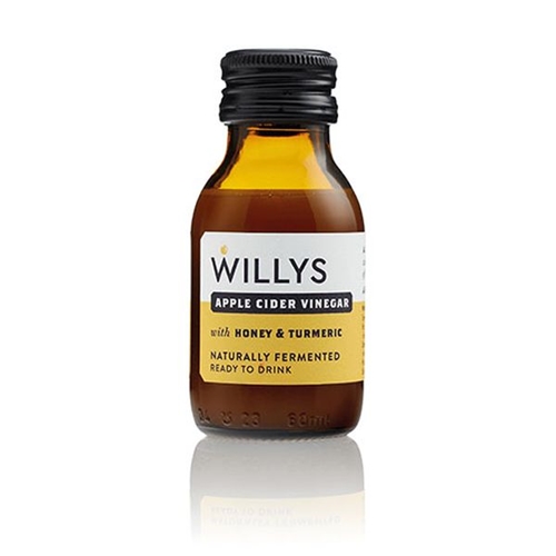 A bottled sunbeam packed full of probiotic apple cider vinegar with turmeric, black pepper & honey. This ready to drink apple cider vinegar shot is an easy way to get your daily dose wellness. This unique blend of 48 wild apple varieties with a punchy pairing of honey and turmeric creates a unique balance of sweet and sour. Due to the fermentation process Willy’s ACV contains wide array of health benefits, helping you shine from the inside out.